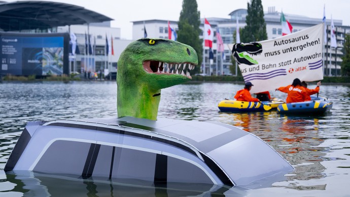 Der "Autosaurus" steht symbolisch für eine nicht mehr zu rettende Autobranche, wie "Attac" mitteilte. Der "Autosaurus" müsse untergehen, forderten die Aktivisten daneben auf einem Banner. Sie forderten: "Bus und Bahn statt Autowahn."