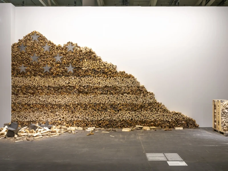 Eine riesige US-amerikanische Flagge empfängt die Besucherinnen und Besucher in der grossen Halle der Art Basel Unlimited. Für einmal nicht aus Stoff, sondern aus unzähligen Holzscheiten und Metallsternen. Einige der Sterne und Holzscheite liegen vor der Flagge am Boden, so als wäre sie beschädigt worden.