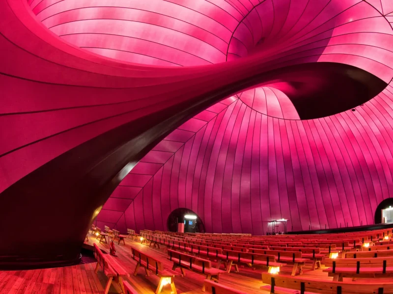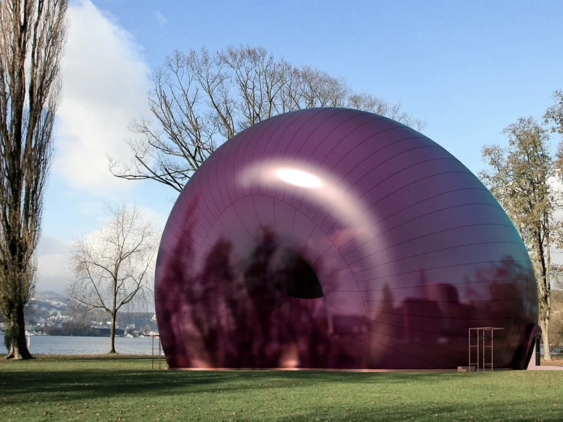 Sie sieht aus wie ein riesiger Ballon aus glänzend-violettem Plastik. 18 Meter hoch ist die Konzerthalle «Ark Nova», wenn sie aufgeblasen ist. Ihre Hülle ist aus einem sechs Millimeter dünnen Gewebe. Zwei Lagen davon sind zusammengeschweisst, dazwischen lässt sich Luft pumpen.