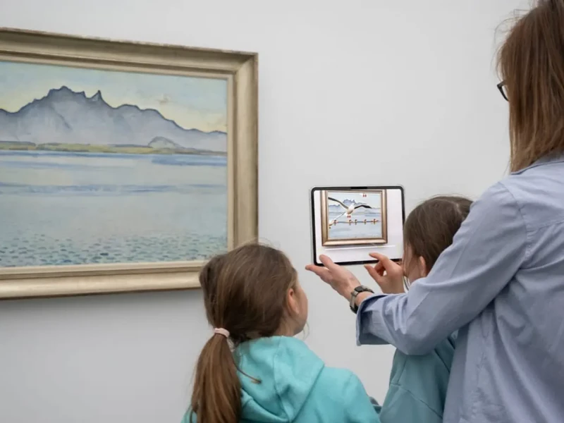 Richtet man im Aargauer Kunsthaus sein Handy auf eine Landschaft von Hodler, wird das Gemälde auf dem Bildschirm lebendig: Ein Mensch klettert auf den Berg, ein Flugzeug fliegt vorbei. Wie das geht, zeigen in der Sammlung des Aargauer Kunsthauses zwei Primarschülerinnen.