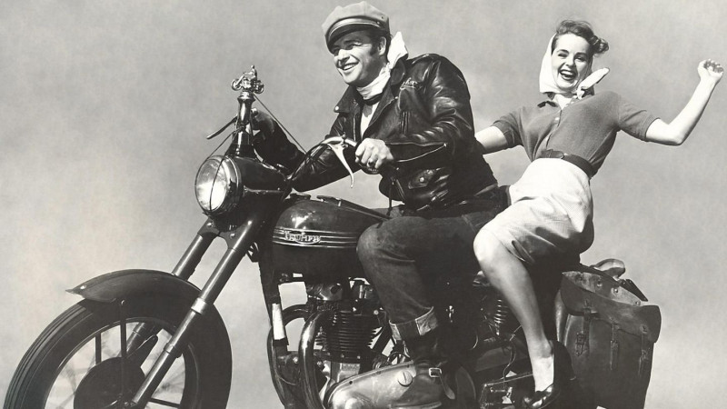 Der BRMC hält eine amerikanischen Kleinstadt in Schach, Brando alias Johnny flirtet mit der Tochter des Polizeichefs, im Laufe des Films kommt es zur Eskalation mit einer weiteren Biker-Gang. Marlon Brando, damals 29, wurde durch seine Rolle zum Symbol der "Halbstarken". Natürlich in Bikerjacke © Courtesy Everett Collection/ / Picture Alliance