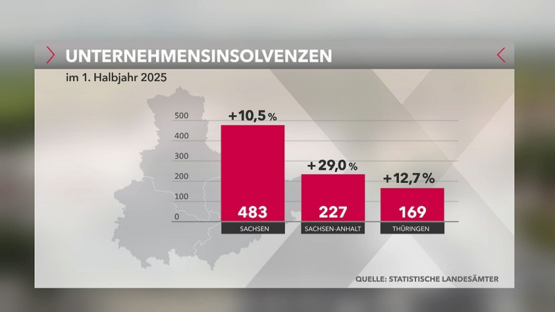 Tatsächlich sind die Unternehmensinsolvenzen in diesem ersten Halbjahr in allen drei mitteldeutschen Bundesländern im Vergleich zum Vorjahr gestiegen. In Sachsen und Thüringen gab es mehr als zehn Prozent mehr Insolvenzen als im ersten Halbjahr 2024. Die größte Zunahme hatte Sachsen-Anhalt mit 29 Prozent.