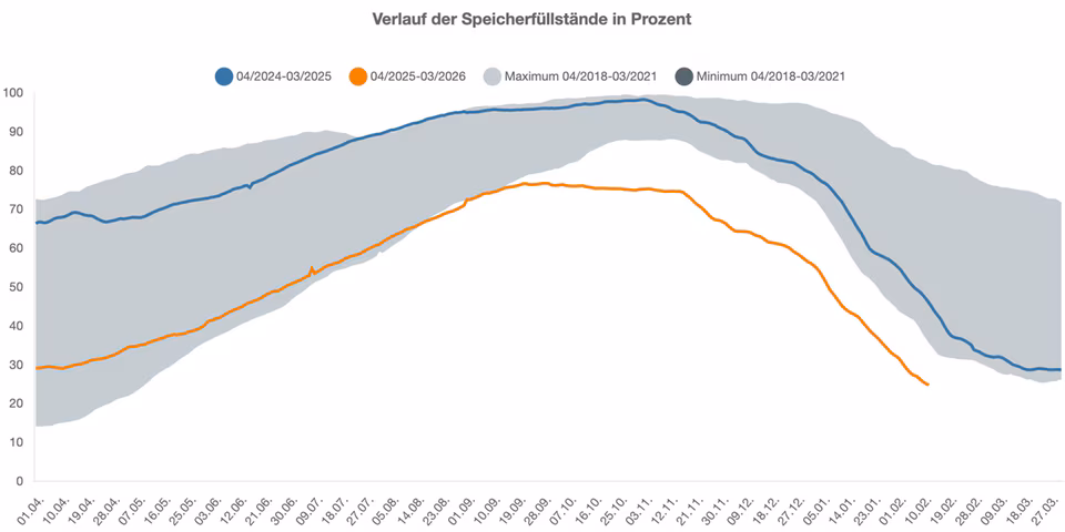 Hinzu kommt ein insgesamt kälterer Winter 2025/26 mit längeren Kältephasen, der den Verbrauch erhöht und zu stärkerer Leerung der Gasspeicher geführt hat, sodass das Niveau nun klar unter dem des Vorjahres liegt.